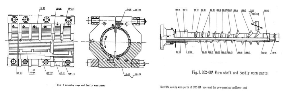 La jaula de prensado y el eje del tornillo de prensado son los componentes principales de este equipo. Primero, el material es presionado por el mecanismo de alimentación y entra continuamente en el espacio entre la jaula y el eje del tornillo de prensado (llamado cámara de prensado). Debido a la rotación del eje del tornillo de prensado y la cámara de prensado, la holgura se reduce gradualmente. El material se somete a una intensa presión y la mayor parte se extrae del aceite. A continuación, el aceite fluye a través de la holgura de la jaula de prensado.